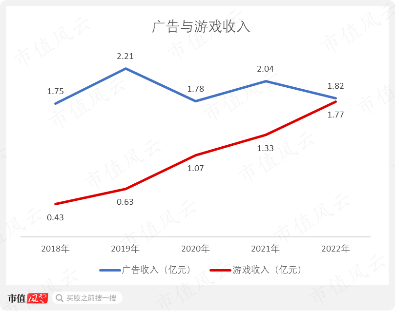 业务板块方面,广告收入在2018-2022年期间基本在小范围内波动,并无明显的增长或减少趋势。游戏收入的增长趋势则非常明显,其从2018年的0.43亿元逐年递增至2022年的1.77亿元,期间CAGR达到43%。