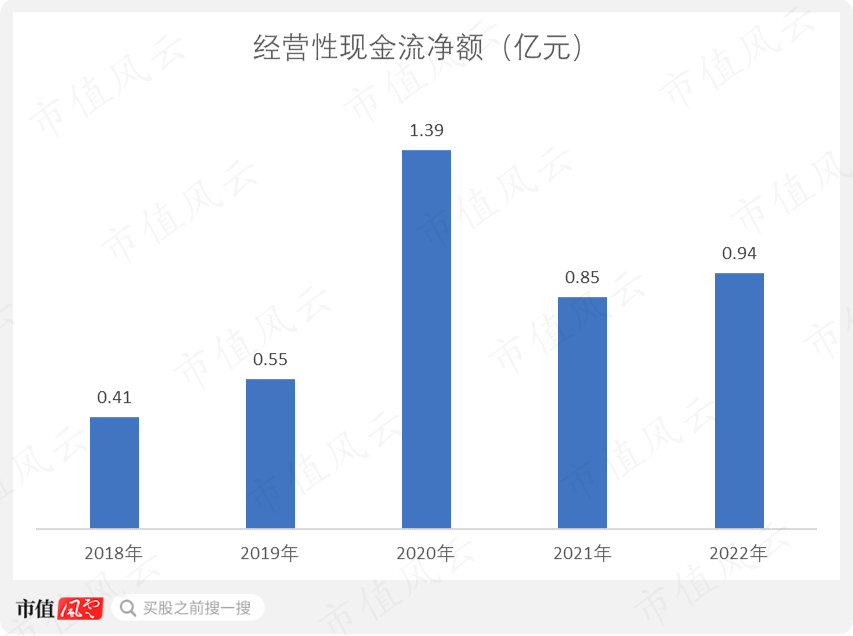 过去五年,营收和利润虽然表现不佳,但是现金流表没毛病,整体呈现上涨趋势。经营性现金流净额从2018年的0.41亿元增长至2022年的0.94亿元。公司没啥资本性开支,经营性现金流净额几乎就等于自由现金流。