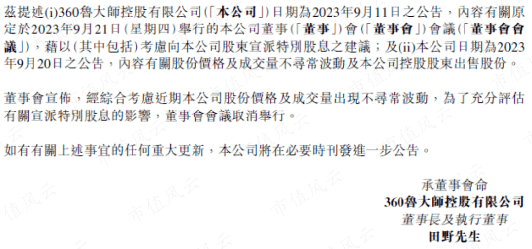 眼看大股东已经减持完毕,股价又回落到之前的低位,于是公司立马变脸,于9月21日发布公告说,取消原定于9月21日召开的有关派发特别股息的会议。
