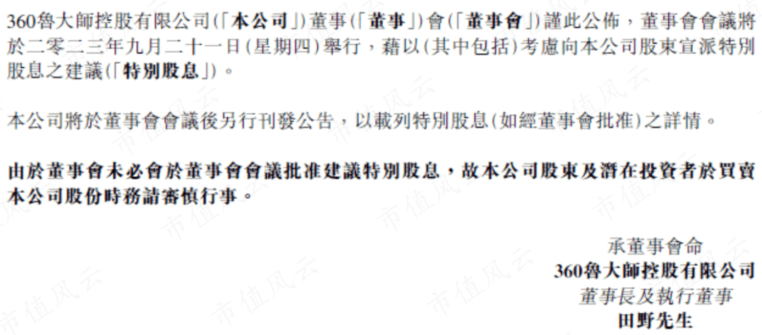 整个事件发端于9月11日公司发布的一则公告。该公告说公司准备在9月21日召开董事会会议,并考虑向股东派发特别股息。