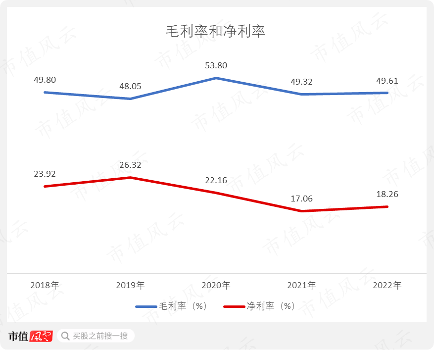 2018-2022年,公司的毛利率一直保持在50%左右,同期净利率则从23.92%下滑至18.26%,盈利能力走弱。