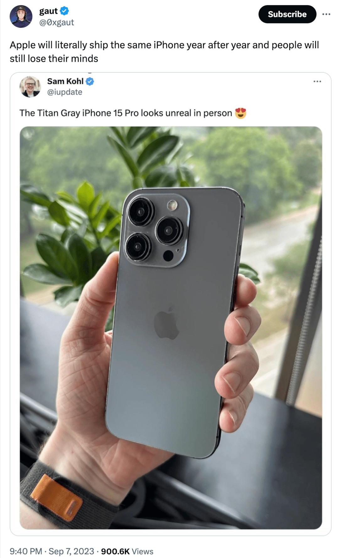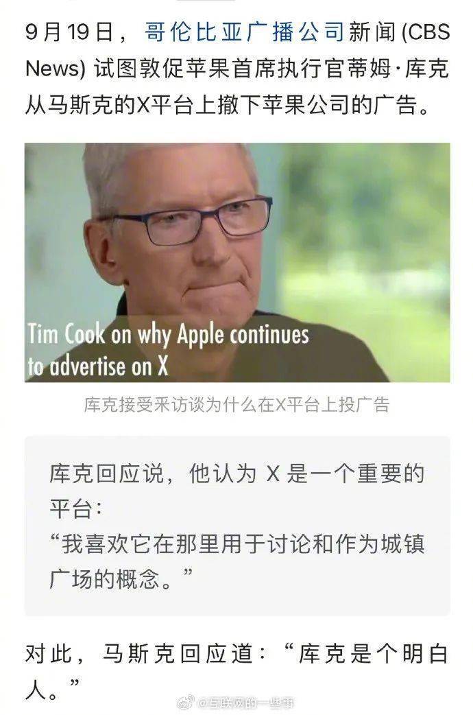 而有意思的是,就在本月初,苹果发布会前几天,马斯克还在一条吐槽iPhone无新意的帖文中称:“我不太清楚我现在的iPhone和之前的版本有什么不同。相机好了10%?”