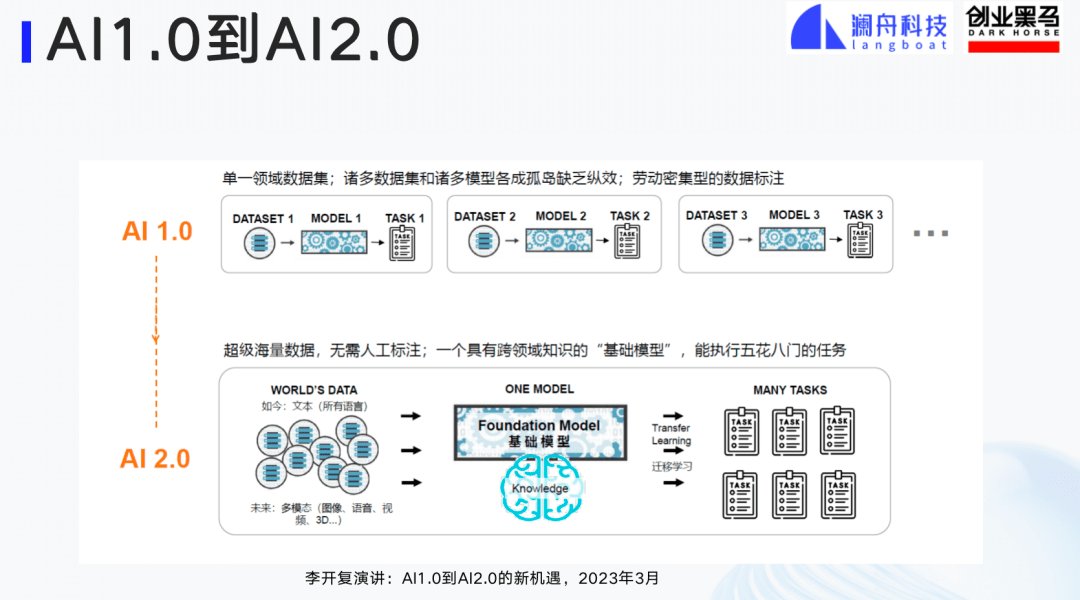 这里要提到大模型带来的影响。AI的1.0到2.0的观点,是李开复博士在今年三月份提出来的。