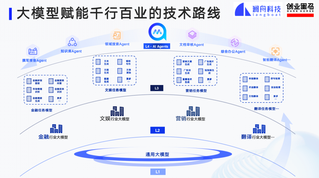 它背后每一层对应不同的客户。比如说L1和L2可以对应开发者,L3是专业人员,L4是普及性人员或者管理人员。真正做L4的时候,我们要从专业和领域出发去做,如果泛泛地说做没有任何边界,什么都可以做的L4,目前来讲做不到。我们在企业发展的时候,要先从具体的行业和场景出发,再一点点拓宽边界。