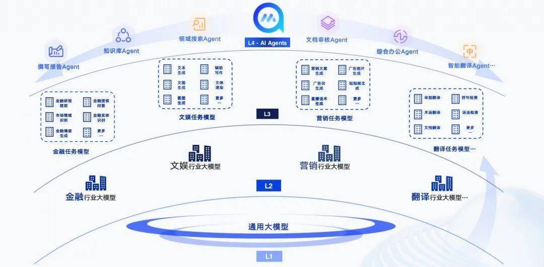 第四层,在此基础上还要有一个L4,AI Agents。用户只想完成任务,我把任务用自然语言描述出来之后,你自己去分解任务,决定每一个任务要用哪个模型,这些任务谁先执行谁后执行,最后把我的任务完成。