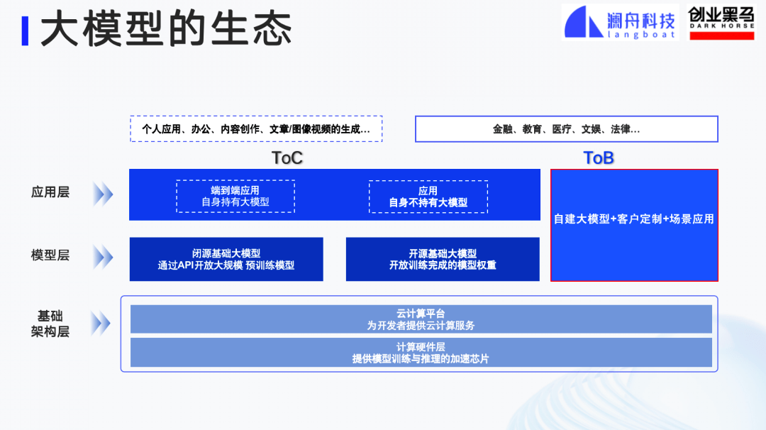跟大家分享一下大模型的生态,基础层、模型层、应用层。