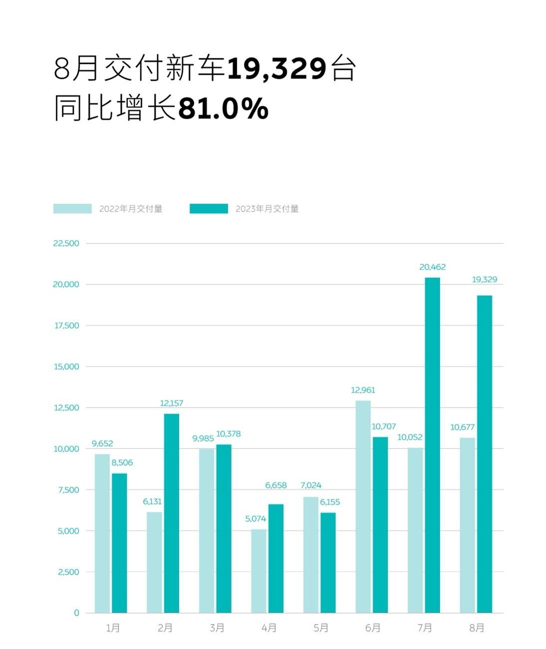9月1日,蔚来公布2023年8月交付量,共交付新车19,329台,同比增长81.0%。2023年1-8月,蔚来共交付新车94,352台。蔚来新车已累计交付383,908台。