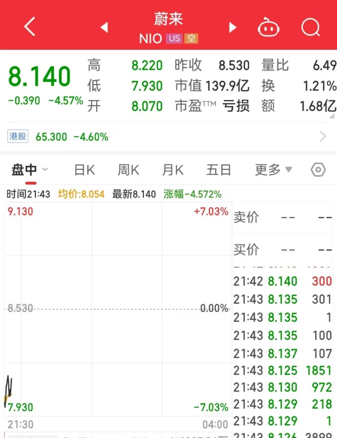 盘面上,美股三大股指集体低开,蔚来汽车跌超5%,截至发稿,蔚来股价跌4.57%,报8.14美元/股,总市值139.9亿美元。