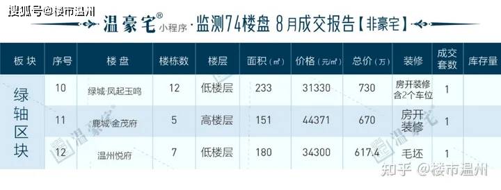 从温豪宅提供的数据显示,相比前半年,8月是今年最为低迷的一个月,仅成交了3套,绿城·凤起玉鸣12楼233㎡,以单价31330元/㎡。成交价相较于开盘价,处于亏损,主要受隔壁鹿城壹号至今仍有少量新房房源在售的影响较大。其中该小区“王者户型”249㎡15号楼交付至今成交0套。