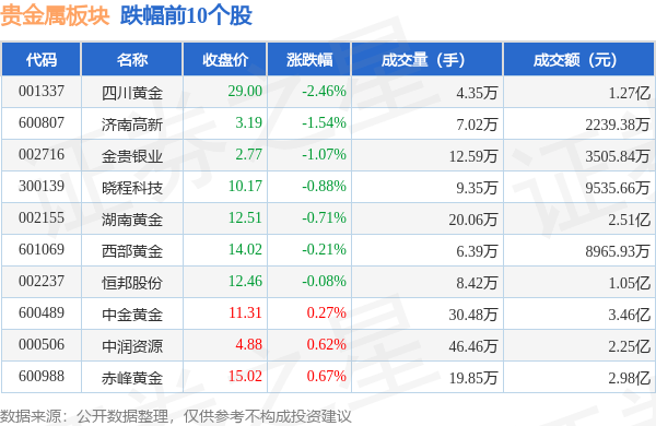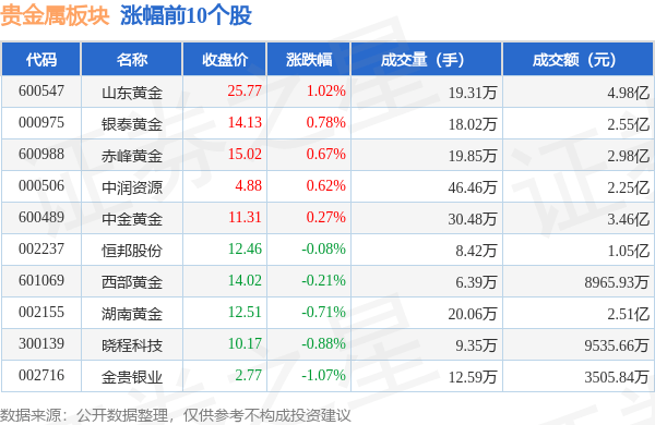 9月25日贵金属板块较上一交易日上涨0.48%,山东黄金领涨。当日上证指数报收于3115.61,下跌0.54%。深证成指报收于10120.62,下跌0.57%。贵金属板块个股涨跌见下表: