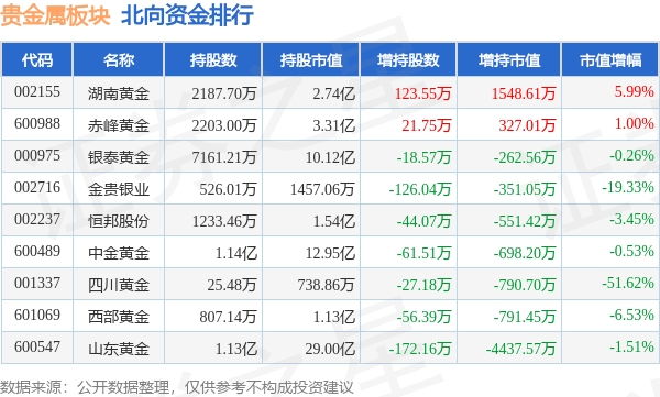 北向资金方面,当日贵金属板块北向资金持股市值为61.0亿元,减持0.6亿元。其中增持最多的是湖南黄金,增持了0.15亿元。减持持最多的是山东黄金,减持了0.44亿元。贵金属板块北向资金持股变动明细见下表: