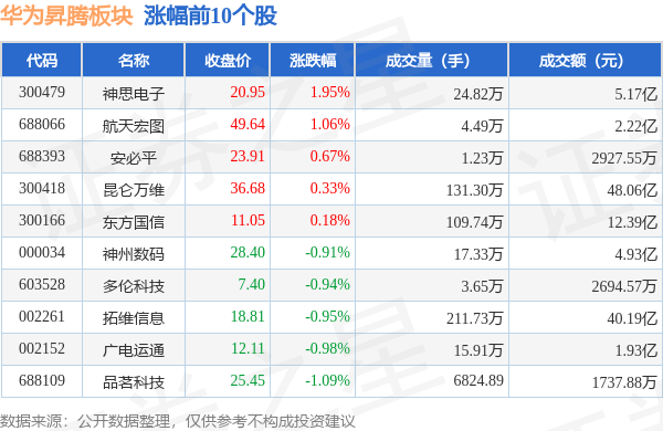 北向资金方面,当日华为昇腾板块北向资金持股市值为30.67亿元,增持1.06亿元。其中增持最多的是昆仑万维,增持了0.9亿元。减持持最多的是航天宏图,减持了0.26亿元。华为昇腾板块北向资金持股变动明细见下表: