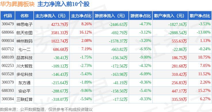 从资金流向上来看,当日华为昇腾板块主力资金净流出11.89亿元,游资资金净流入2.88亿元,散户资金净流入9.0亿元。华为昇腾板块个股资金流向见下表: