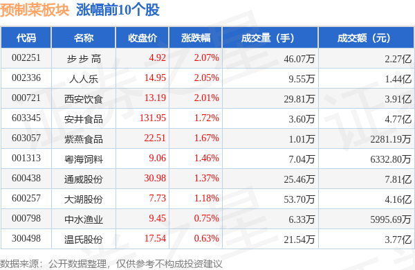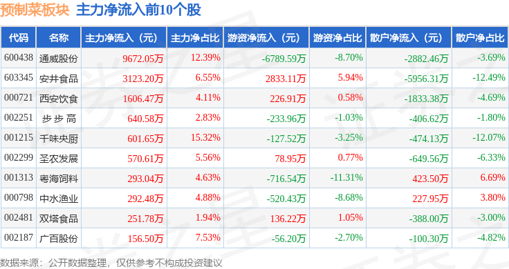 从资金流向上来看,当日预制菜板块主力资金净流出6814.97万元,游资资金净流出3301.97万元,散户资金净流入1.01亿元。预制菜板块个股资金流向见下表:
