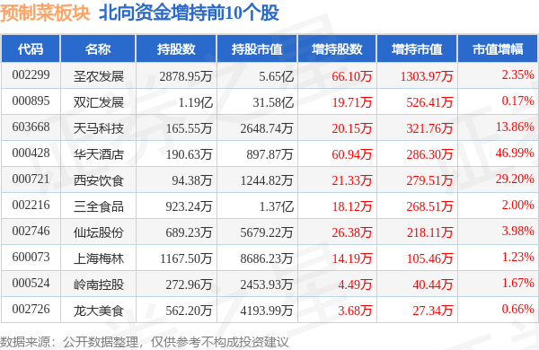 北向资金方面,当日预制菜板块北向资金持股市值为181.52亿元,减持1.48亿元。其中增持最多的是圣农发展,增持了0.13亿元。减持持最多的是通威股份,减持了0.78亿元。预制菜板块北向资金持股变动明细见下表: