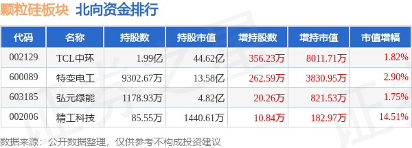 北向资金方面,当日颗粒硅板块北向资金持股市值为63.17亿元,增持1.28亿元。其中增持最多的是TCL中环,增持了0.8亿元。颗粒硅板块北向资金持股变动明细见下表: