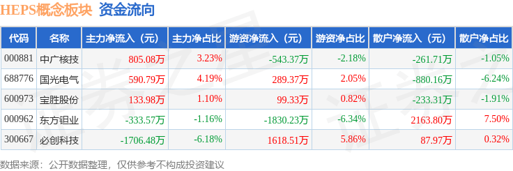 从资金流向上来看,当日HEPS概念板块主力资金净流出510.2万元,游资资金净流出366.39万元,散户资金净流入876.59万元。HEPS概念板块个股资金流向见下表: