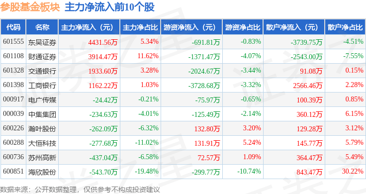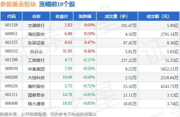 从资金流向上来看,当日参股基金板块主力资金净流出16.33亿元,游资资金净流入4.59亿元,散户资金净流入11.74亿元。参股基金板块个股资金流向见下表: