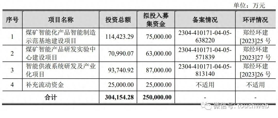 恒达智控计划募资25亿元,其中,7.5亿元用于煤矿智能化产品智能制造示范基地建设项目,6.3亿元用于煤矿智能产品研发实验中心建设项目,8.7亿元用于智能供液系统研发及产业化项目,2.5亿元用于补充流动资金。