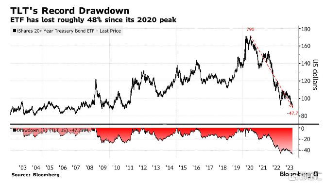 彭博社汇编的数据显示,价值390亿美元的iShares 20多年期国债ETF已从2020年的历史高点下跌48%,交易处于2011年以来的最低点。今年迄今为止,该ETF跌了约10%,此前去年跌了33%,2021年跌了6%。