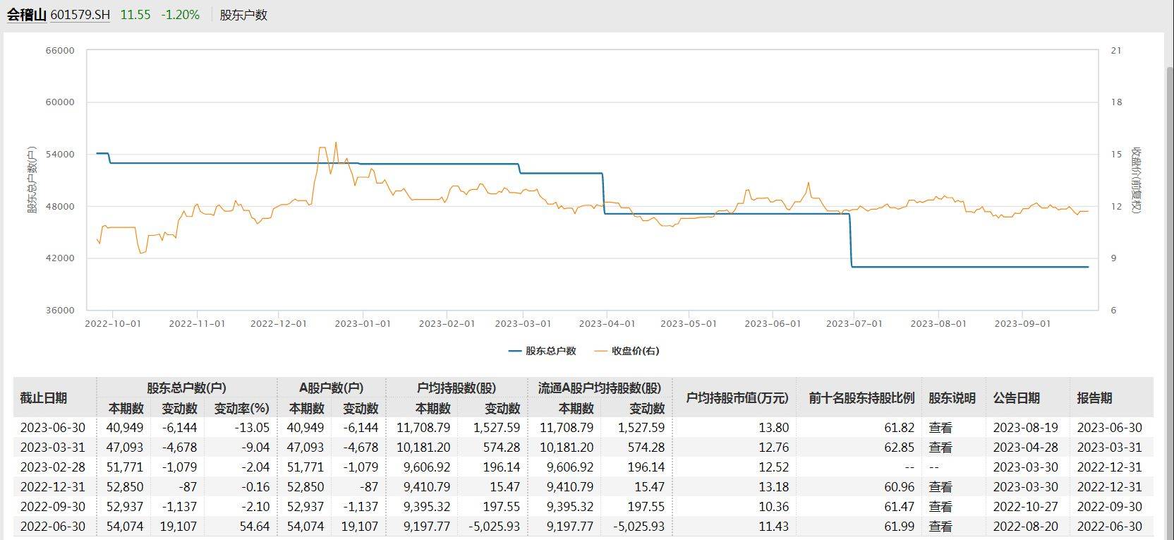 另需一提的是,Wind显示,自去年三季度以来,会稽山股东总户数便开始下降。截至2022年9月30日,公司股东总户数52937户;截至2023年6月30日,公司股东总户数40949户。