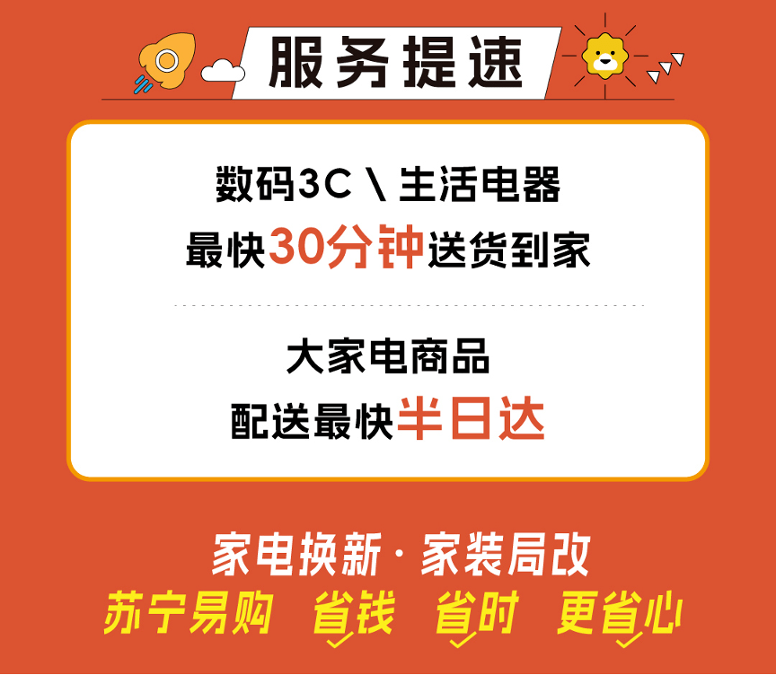 在服务履约方面,配送时效将进一步提升。双节期间,苏宁易购将持续深化与美团、饿了么的合作,消费者在即时零售平台购买苏宁易购3C数码及生活电器,最快可30分钟送货上门。针对大家电商品,苏宁易购也在双节期间在上海试点“送货最快半日达、送装一天完成”的极速体验,服务覆盖空调、冰箱、洗衣机、厨电等主流家电品类,消费者上午11点前下单,当天晚上8点前送达;下午6点前下单,次日下午2点前送达。在安装时效上,上午送达的订单,当天完成安装;下午送达的订单,24小时内完成安装。