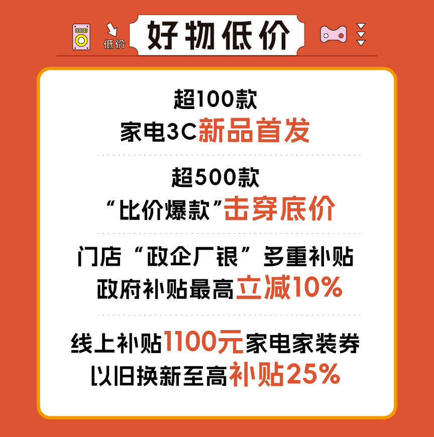 在线上,苏宁易购平台也加大补贴力度,消费者通过苏宁易购APP可领1100元家电家装补贴神券,同时享大家电爆款满1000减100、以旧换新至高补贴25%、最高24期分期免息、套购多件多折、家装品类每满200减30、3C数码限量千元券等丰富优惠。