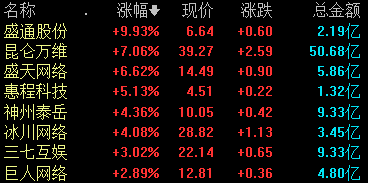 游戏板块表现活跃,截至午盘,盛通股份涨停,昆仑万维、盛天网络、冰川网络等多股跟涨。