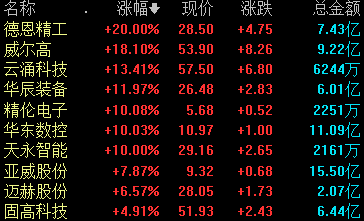 新型工业化概念股大涨,截至午盘,德恩精工20%涨停,精伦电子5连板,天永智能2连扳,华东数控封涨停,板块内个股近全线飘红。