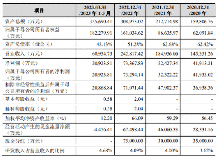 招股书(申报稿)显示,恒达智控2022年实现营收24.3亿元,归母净利润7.3亿元,基本每股收益2.04元,截至2022年末,该公司资产规模达30.89亿元。今年一季度,恒达智控实现营业收入6.1亿元,归母净利润2.09亿元,基本每股收益0.58元。