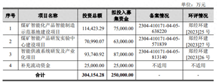 恒达智控招股说明书(申报稿)显示,公司本次拟发行股份不超过 6352.94万股,占发行后总股本的比例不低于10%,发行后总股本不超过42352.94万股。募集资金25亿元,主要投向煤矿智能化产品智能制造示范基地建设项目、煤矿智能产品研发实验中心建设项目、智能供液系统研发及产业化项目、补充流动资金。