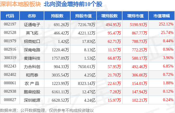 北向资金方面,当日深圳本地股板块北向资金持股市值为191.12亿元,减持2.17亿元。其中增持最多的是证通电子,增持了0.52亿元。减持持最多的是万 科A,减持了0.46亿元。深圳本地股板块北向资金持股变动明细见下表: