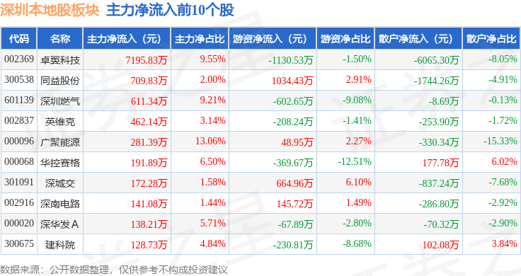 从资金流向上来看,当日深圳本地股板块主力资金净流出6.91亿元,游资资金净流入1.49亿元,散户资金净流入5.43亿元。深圳本地股板块个股资金流向见下表:
