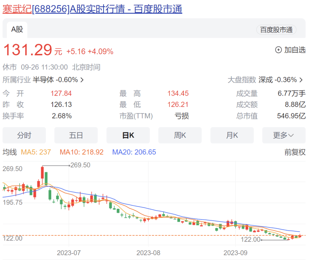 截至26日中午收盘,寒武纪报收131.29元,涨4.09%,总市值546.95亿元。值得注意的是,寒武纪自今年4月21日创下271元高点以来一路下跌,仅5个月时间已经“腰斩”。