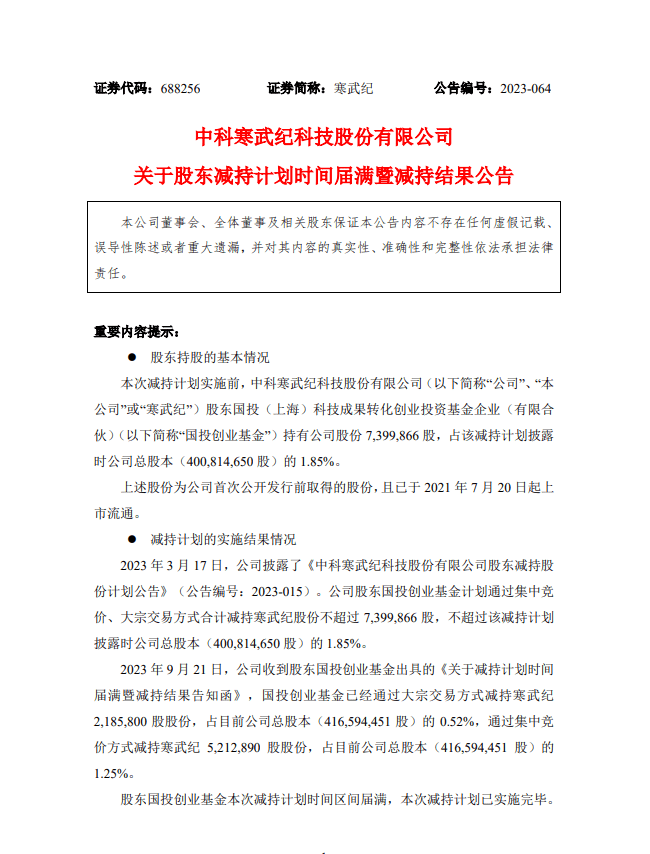 公告显示,9月21日,公司收到股东国投创业基金出具的《关于减持计划时间届满暨减持结果告知函》,国投创业基金已通过大宗交易方式减持寒武纪218.58万股股份,占目前公司总股本的0.52%;通过集中竞价方式减持寒武纪521.29万股股份,占目前公司总股本的1.25%。