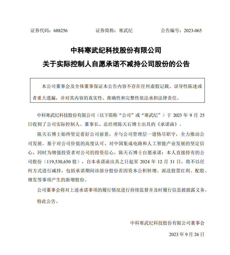今日早间,寒武纪发布公告,公司于9月25日收到了公司实际控制人、董事长、总经理陈天石出具的《承诺函》。
