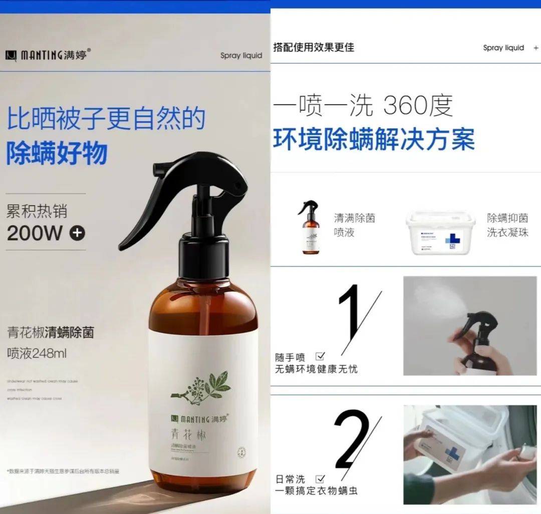 最重要的是,产品更新需要与品牌核心策略保持高度统一,强力占领用户心智。比如在洗护家清领域,每逢推出新品,满婷的效果广告策略都为一致性的打“除螨心智”,即便是促销素材也会尽可能放大除螨的功能性需求,而弱化其他功能,避免分散用户注意力,这样,单月数亿级的曝光体量全部用以强化“除螨心智”,当用户再面临除螨产品选择时,就能清晰意识到,除螨就选满婷。
