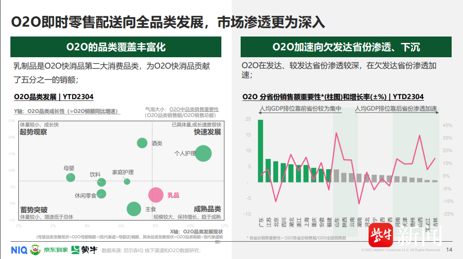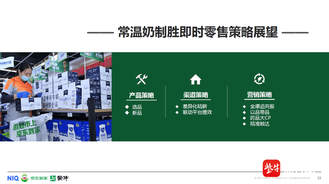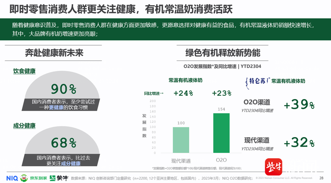 为了探索即时零售领域乳品的发展机遇,中国领先的乳品企业蒙牛集团联合国内即时零售领先的平台京东到家与全球领先的消费者研究与零售监测公司尼尔森IQ(NIQ)共同发布2023年即时零售乳品白皮书。报告指出,即时零售常温奶消费将呈现五大趋势:极致性价比、奶源保质、健康、特色创新和合理多包装。