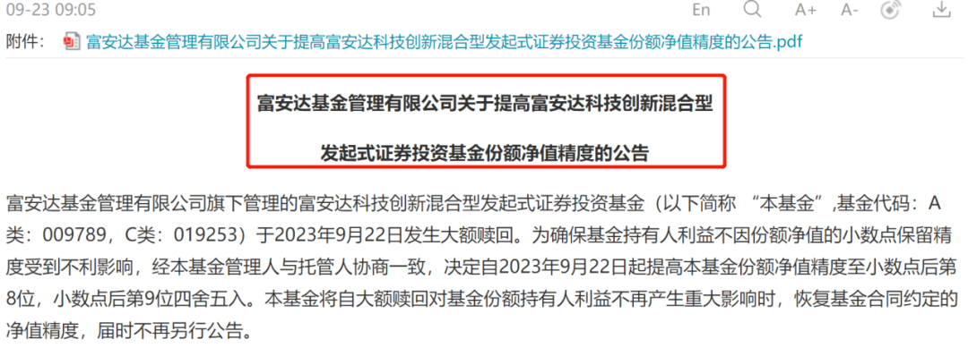 比如,9月23日,富安达基金发布关于提高富安达科技创新混合基金份额净值精度的公告。该基金于2023年9月22日发生大额赎回。为确保基金持有人利益不因基金份额净值的小数点保留精度受到不利影响,经公司与基金托管人协商,决定自2023年9月22日起提高本基金份额净值精度至小数点后八位,小数点后第九位四舍五入。