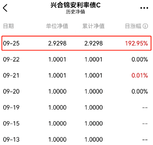 9月25日净值显示,兴合锦安利率债C单日净值暴涨192.95%,基金净值一天从1.0001元,飙涨到2.9298元。A份额净值也大涨181.44%,最新份额净值为2.8150元。