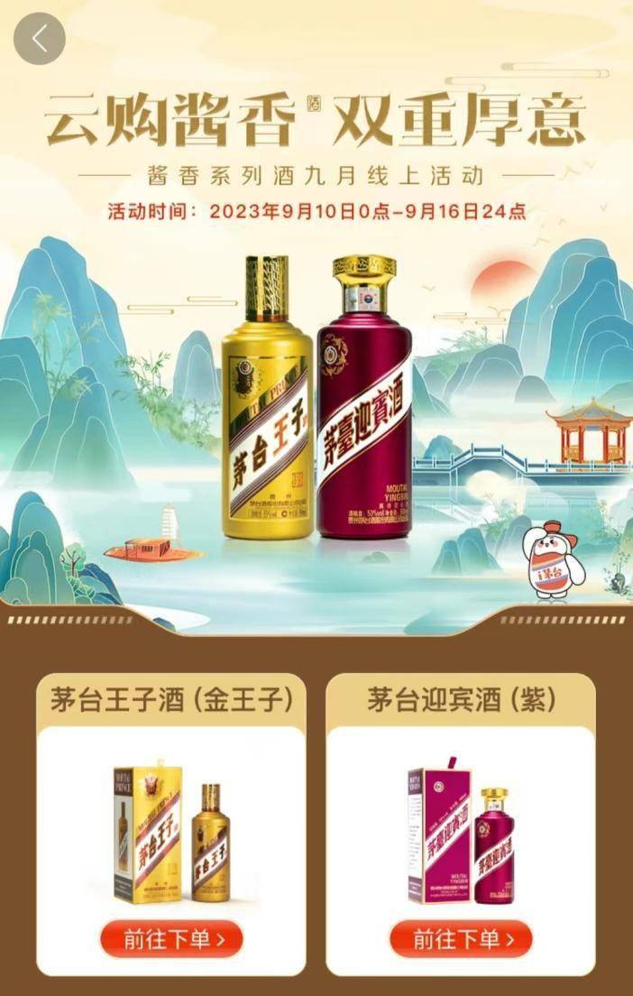 9月10日至16日期间,茅台开启了酱香系列酒线上活动:在i茅台APP上,用户购买茅台王子酒或茅台迎宾酒2瓶以上,即可参与满赠活动或抽奖活动。