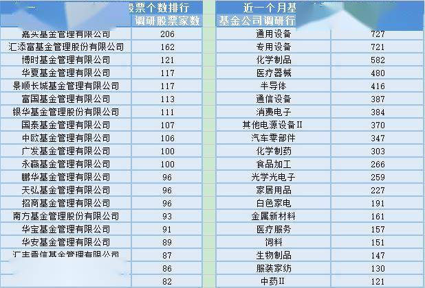 近一个月(8月26日-9月26日),嘉实基金参与公司调研的数量最多,共调研206家上市公司,然后调研较为活跃的还有汇添富基金、博时基金、华夏基金,分别调研162家、121家、117家上市公司;从调研行业上来看,基金公司对通用设备行业的上市公司调研次数最多,共有727次,其次是专用设备行业,基金公司调研了721次。