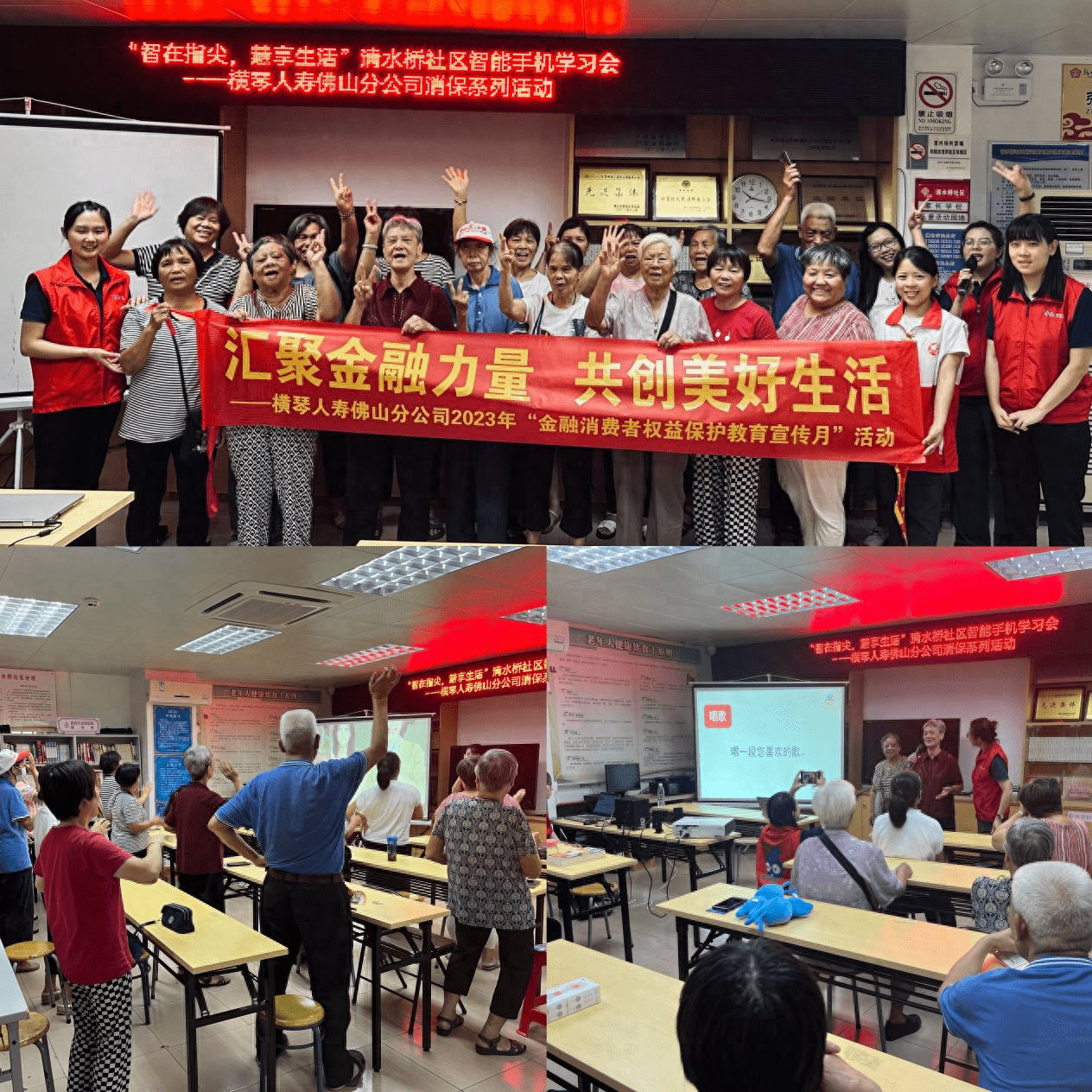 横琴人寿佛山分公司联合清水桥社区开展了面向老年人的金融知识宣传专项活动。在活动现场,工作人员首先通过与老年人进行了健康舞蹈暖场活动,拉近彼此的距离。随后为老年人讲解智能手机使用,让其不再苦恼操作困难,同时在过程中融入常见的诈骗套路和在使用的过程中如何保护个人信息。最后以深入浅出、幽默的方式,分享身边金融诈骗案例;并通过游戏(如你画我猜、击鼓传花等)的方式,进行金融知识普及,现场互动氛围良好,笑声不断。