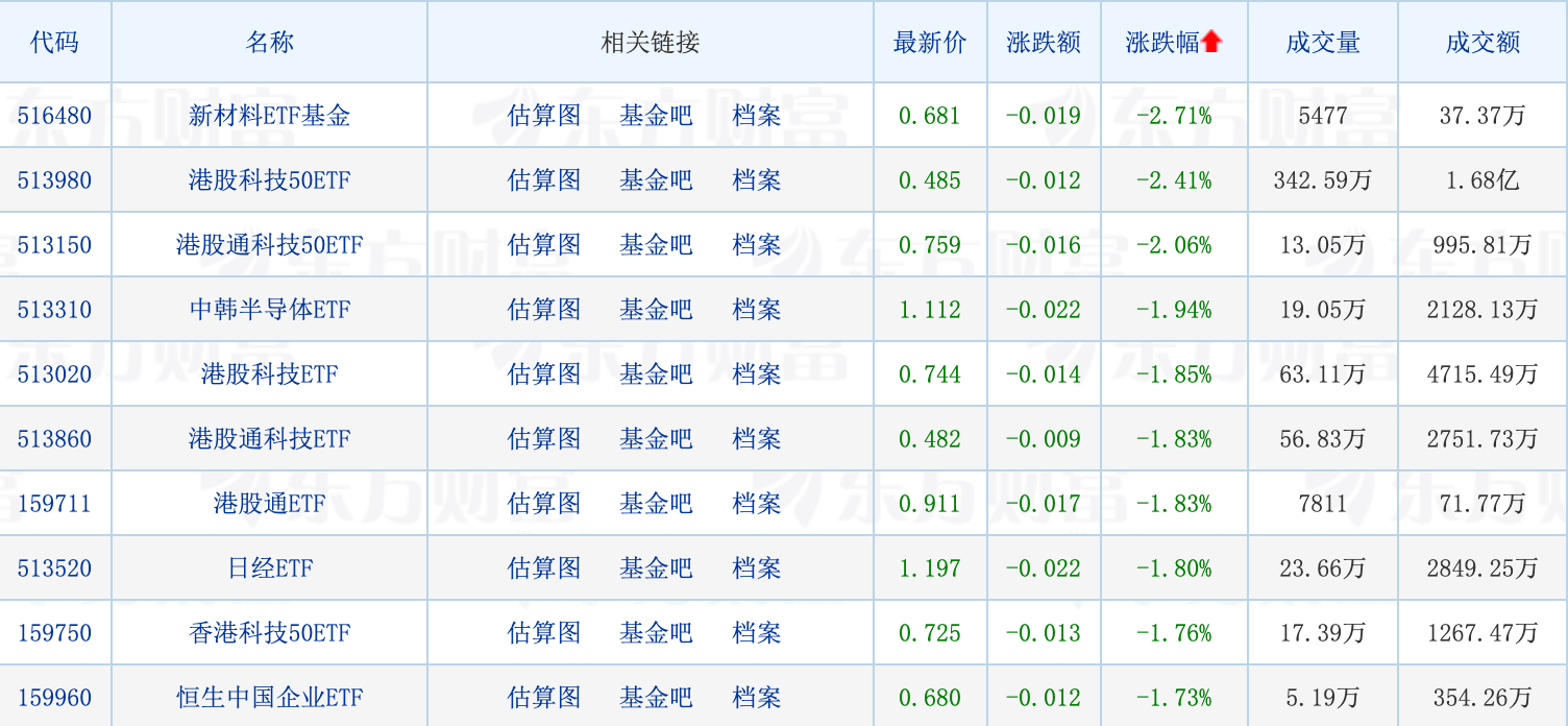 下跌方面,港股恒生科技指数回调明显,带动多只港股科技ETF走跌,最高下跌2.41%。