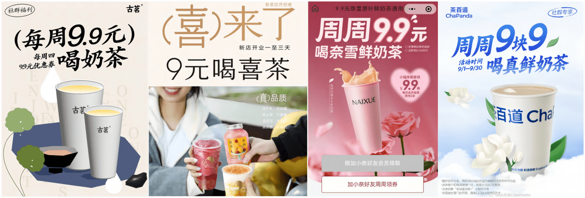 不难发现,这轮9.9运动中,把9.9与社群、私域结合起来,尽可能压榨价格的吸引力,引流带动品牌的综合建设,正是不少玩家的追求。典型的例子有奈雪的茶、茶百道、古茗、霸王茶姬等。