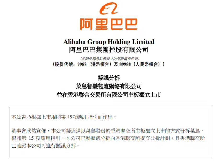 驱动中国2023年9月26日消息 阿里巴巴今日在港交所发布公告,公司拟通过以菜鸟股份于香港联交所主板独立上市的方式分拆菜鸟。