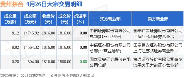 9月26日贵州茅台发生大宗交易,交易数据如下: