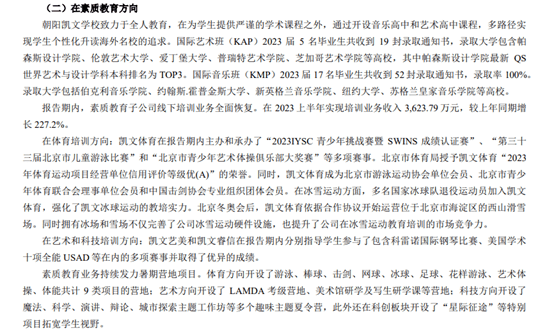 除了职业教育,素质教育也是凯文教育的发力方向。其为两所凯文学校提供素质教育课程,同时朝阳凯文学校开设了国际艺术班(KAP)和国际音乐班(KMP)2022年,凯文教育开始运营西山滑雪场。