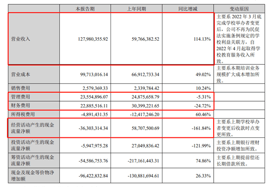 上半年,凯文教育经营活动产生的现金流量净流出3630.3万元,同比从净流入大幅转为净流出状态。截至上半年末,凯文教育的现金及现金等价物余额为3.33亿元,比上年同期增加不足900万元,但比期初则大幅缩减9642.3万元。