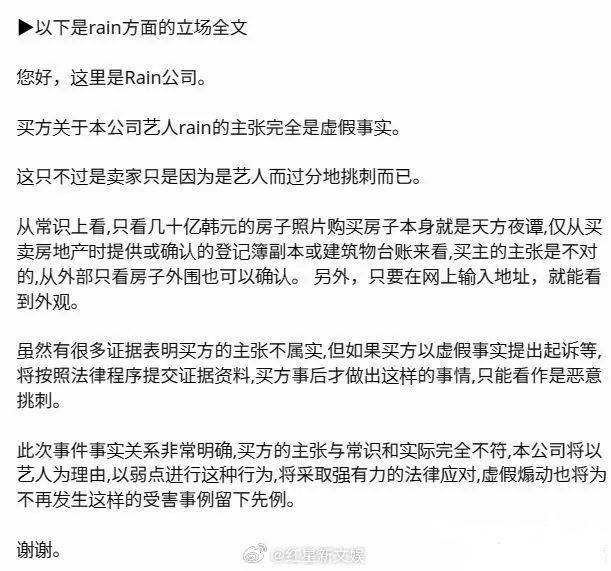 RAIN对指控提出否认,称从未拒绝该买家实地参观房屋,并指出从未发布过带有游泳池的照片。RAIN的经纪公司也发表声明称,该买家的指控完全站不住脚,他们还拥有大量证据来证明买家的指控不属实,并将采取法律措施应对这种利用名人身份进行不实指控的行为。